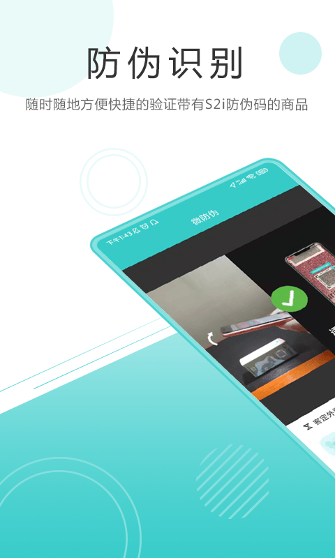 S2i防伪查询软件是您手机上未来不可或缺的一款应用,它将使您的手机变成衡量诚信的天枰,随时随地方便快捷的识别带有S2i的商品,产品解码后的信息即刻显示在手机屏幕上,其中的商品物流信息、厂家信息、真伪查询一目了然。