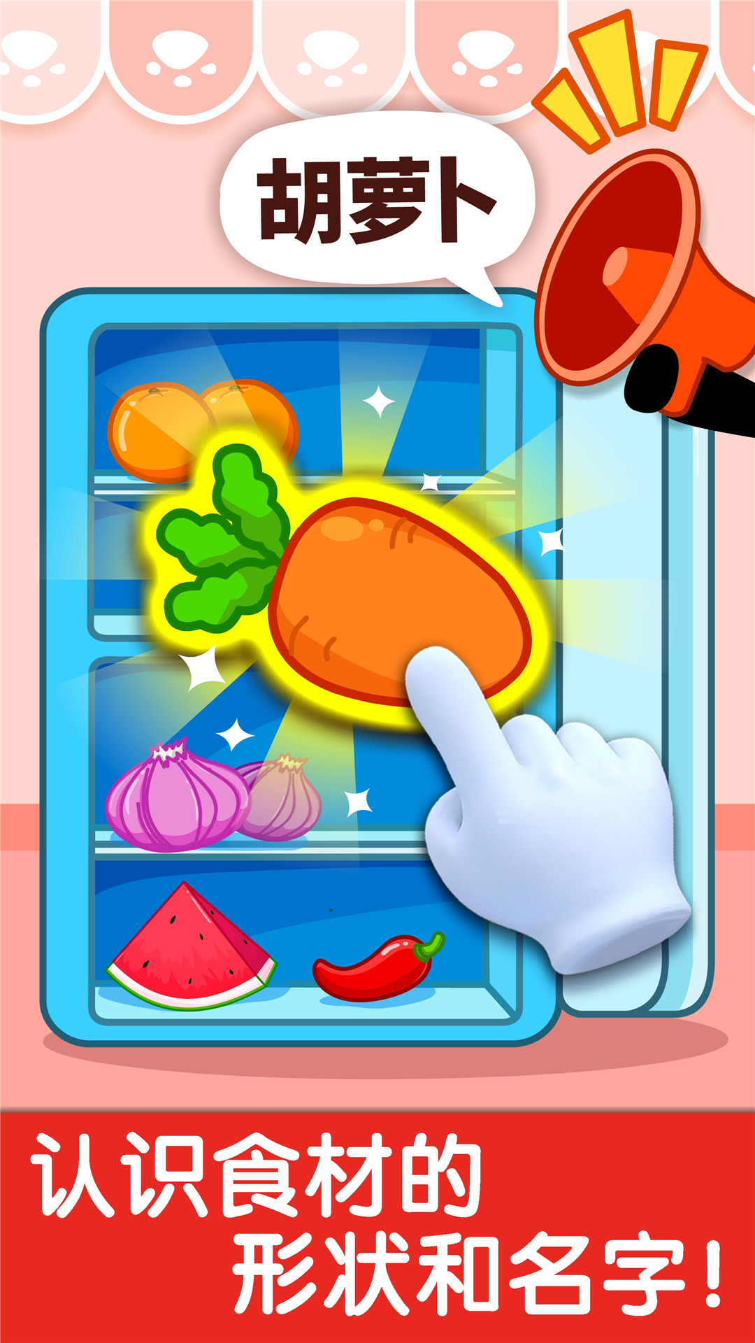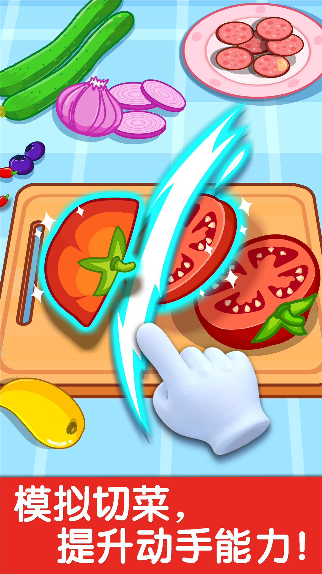—切菜:宝宝手指点点滑动屏幕,就像画画互动一样,专注地处理奇妙美食,爱上吃饭。(认知水果蔬菜和肉类)