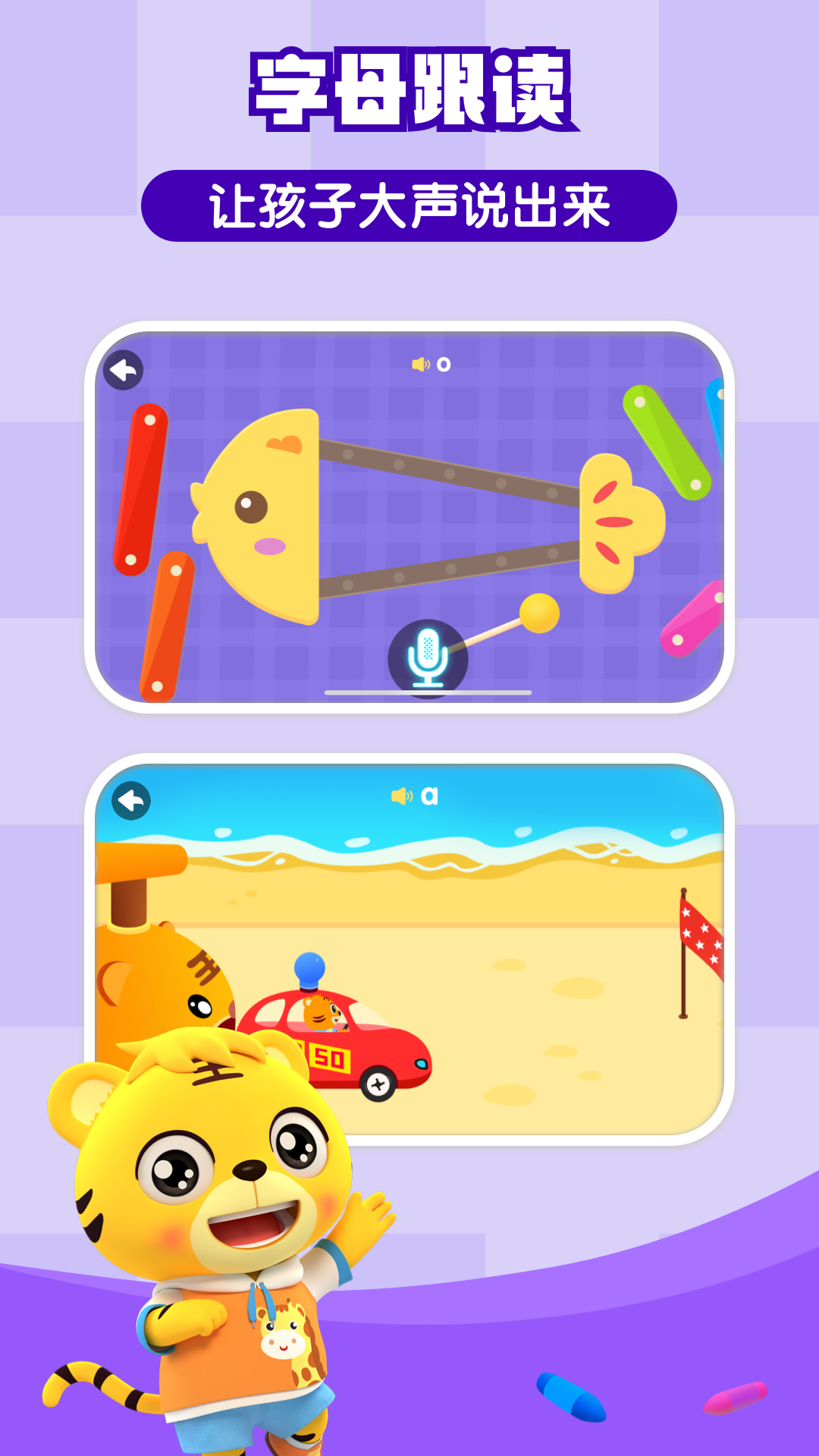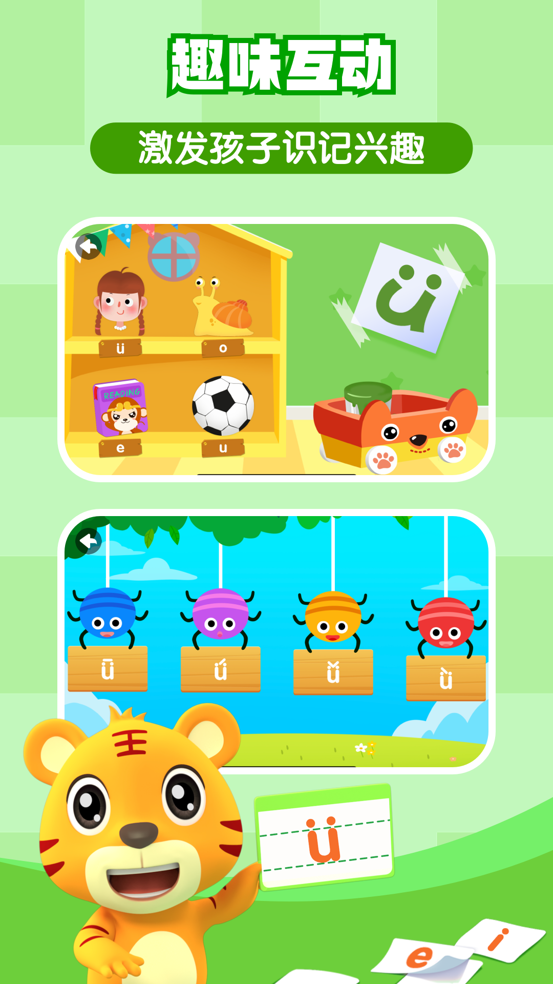 63个拼音全覆盖、126+拼读训练、63对词语卡片、30+互动场景,从认、说、写、练四大维度,科学认知拼音字母!