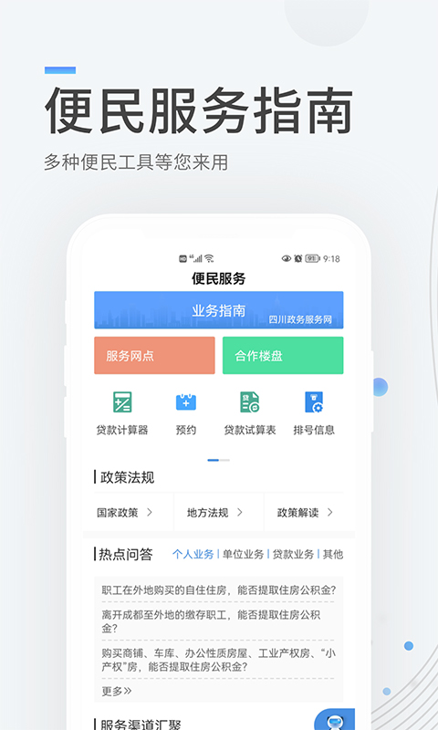 『便民服务』业务指南、服务网点、合作楼盘、政策法规、热点问答,还有多种便民工具供您使用。