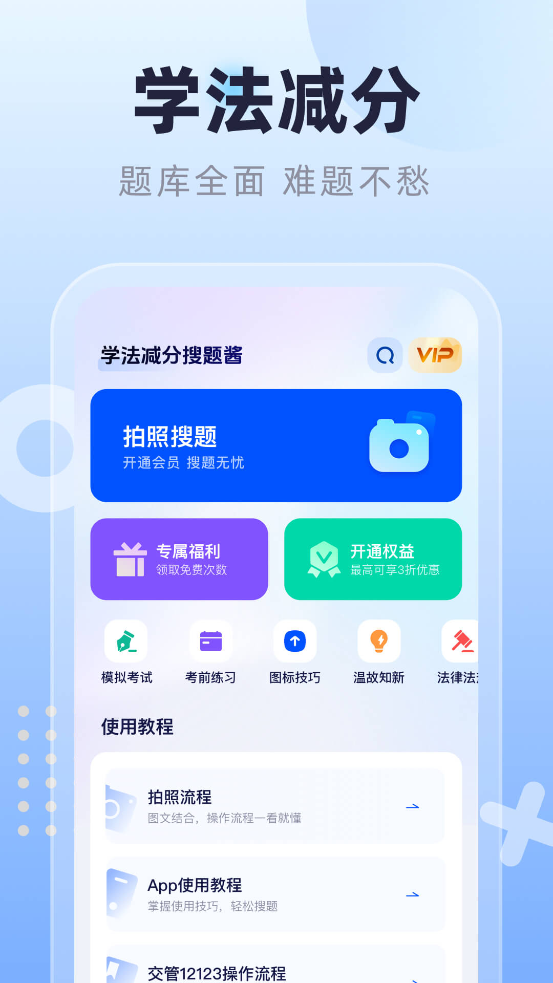 一键拍照找题,准确率高,搜题速度快!帮助考生在学法减分学习中快速掌握试题,有效的提高学习考试效率,助力考生考试通关。