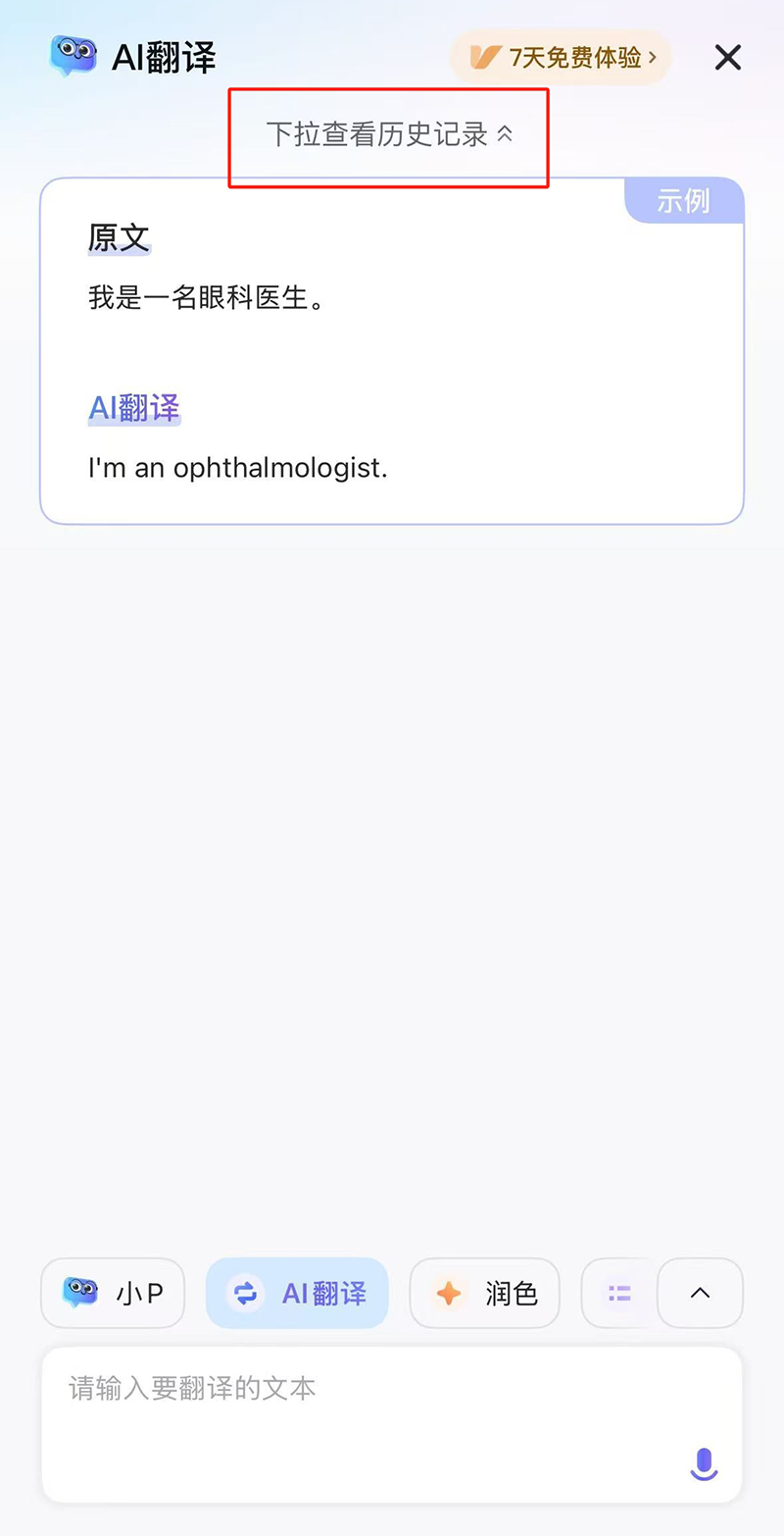 1、重新进入AI翻译界面,在界面上方可以看到“下拉查看历史记录”提示。
