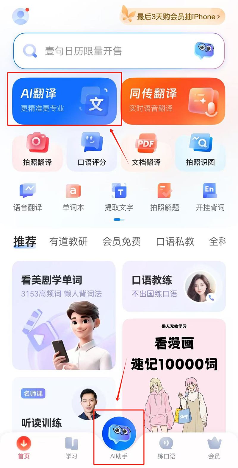 1、打开网易有道词典APP,在首页的功能栏中,点击【AI翻译】或点击下方的【AI助手】图标。