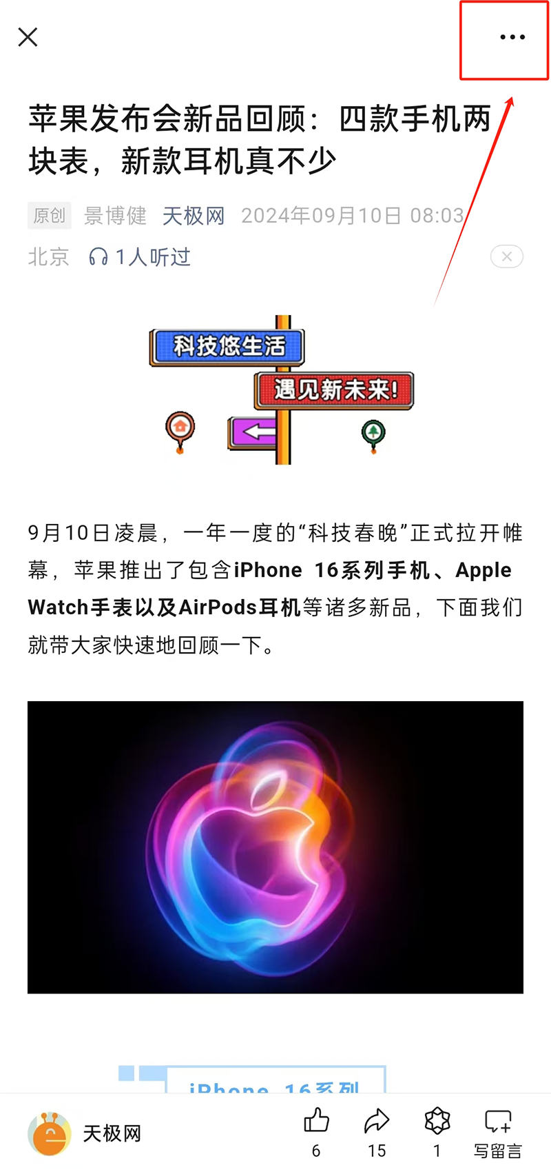 1、首先,在微信中打开想要截取为长图的任意一篇文章,在文章右上角找到并点击【...】按钮。