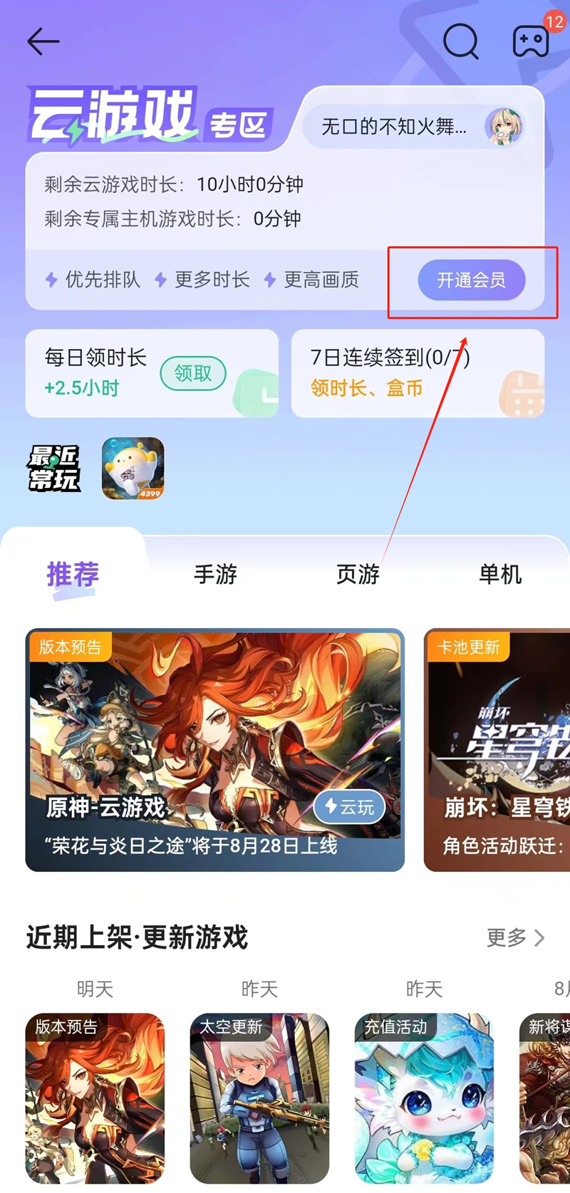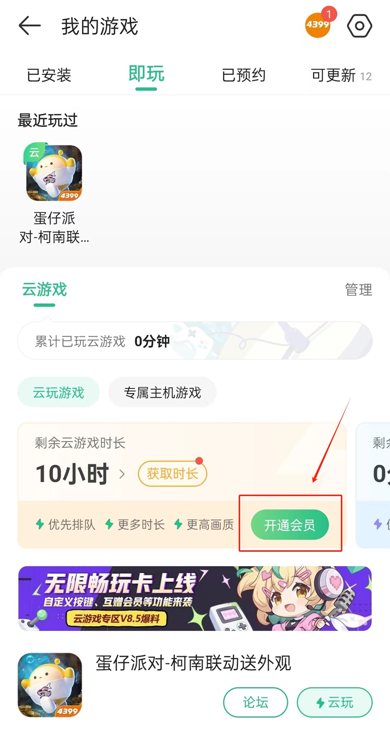 点击进入【我的】-【即玩】- 在【云游戏】相关入口点击"续费会员";