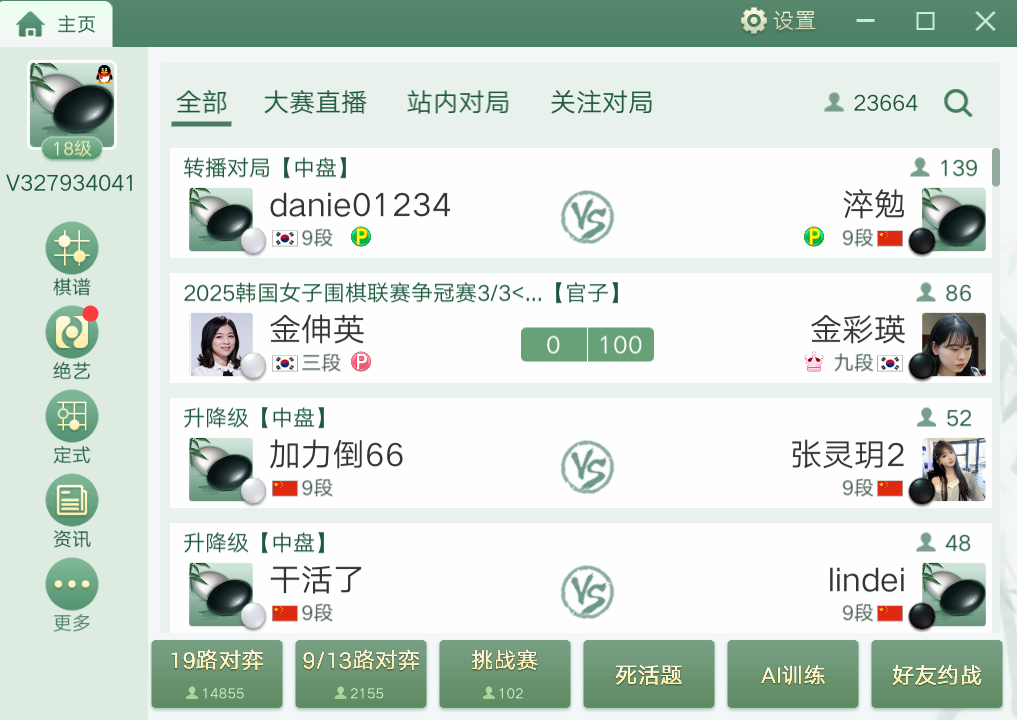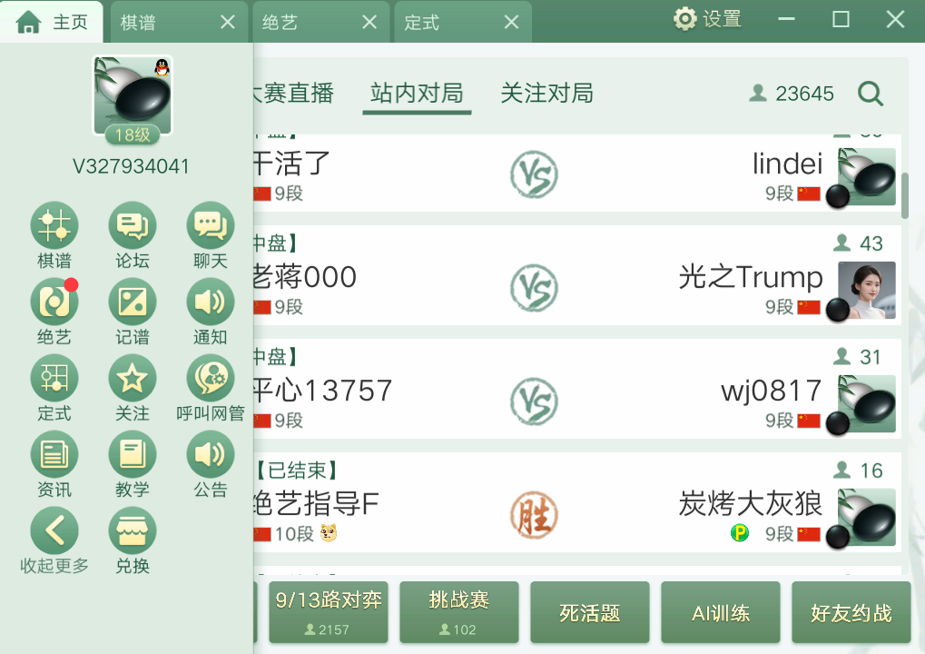 用户可快速匹配到水平相当的对手,支持19/13/9路,支持AI对局。
