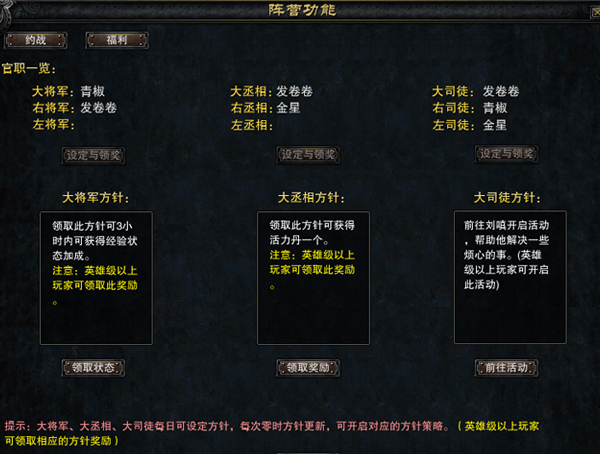 大丞相:可选择阵营每日福利方针,含活力丹每日奖励、武神宝囊每日奖励、星之微尘每日奖励。