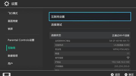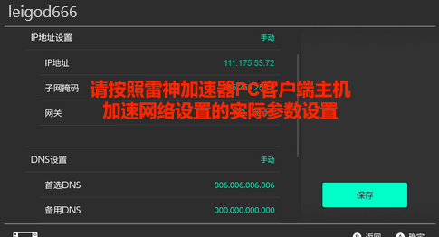 3. Switch设置,选择对应网络,并点击更改设置,将IP地址、子网掩码、网关和DNS改为上面雷神加速器提供的配置,注意,如果不够三位,前面需要补0,完成后返回网络测试,显示连接成功即可游戏了。
