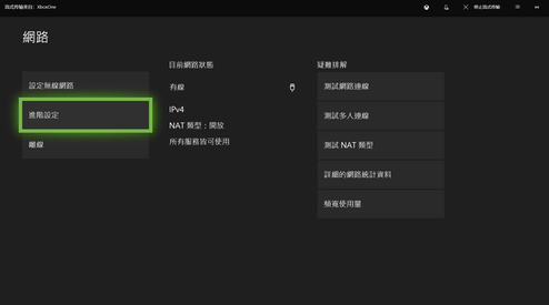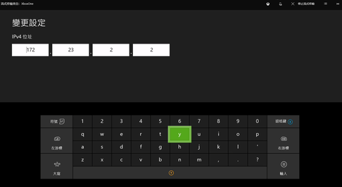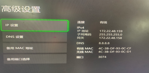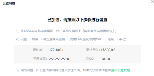 3. 接下来是Xbox的设置,点击控制器中间的Xbox键,然后选择设置->网络->网络设定->进阶设定,之后设置ip,按照上面加速成功后给出的数据设置ip、掩码和网关。之后设定DNS,主要IPv4 DNS输入8.8.8.8,次要IPv4 DNS输入0.0.0.0。完成后一切正常就可以愉快的游戏了。