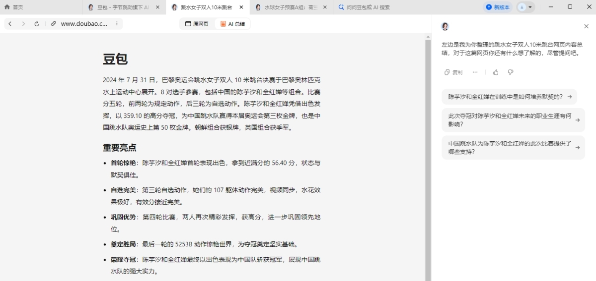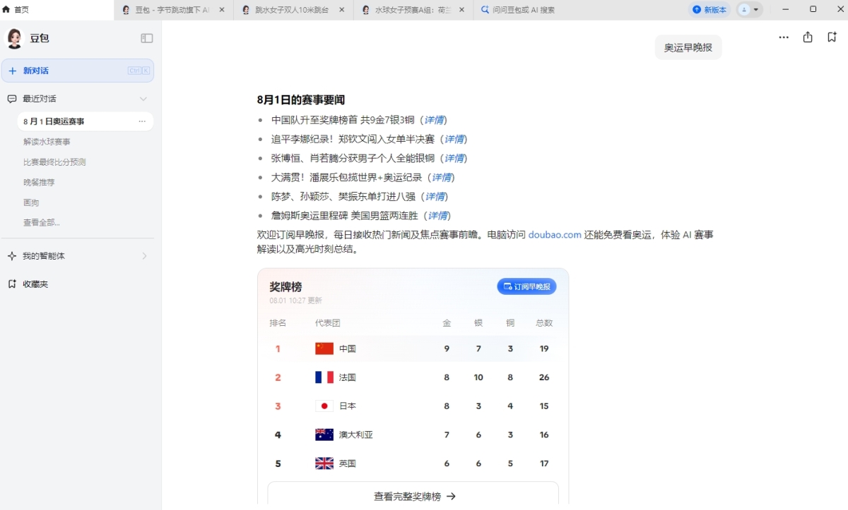 1、豆包【拥有奥运早晚报、AI解读奥运赛事功能】