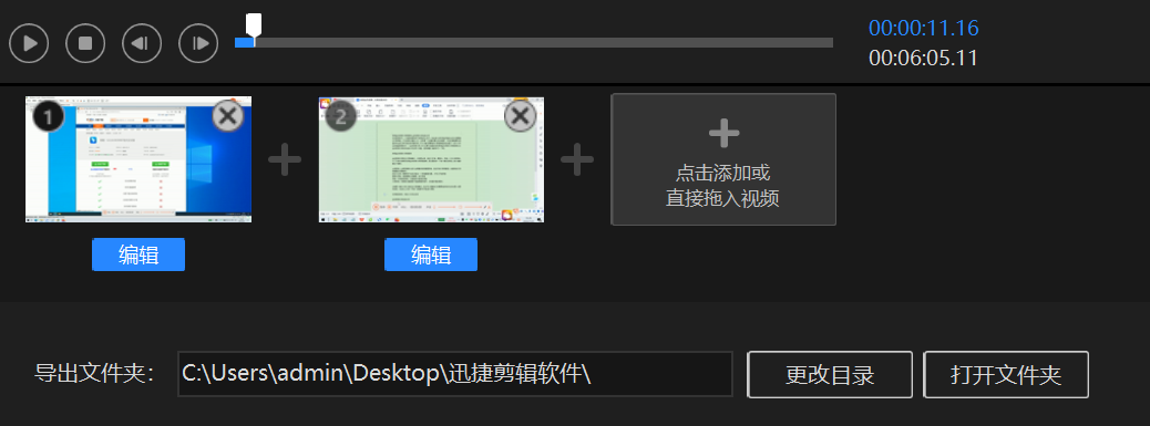 3、我们再点击变为灰黑色的“点击添加或直接拖入视频”按钮,导入第二个视频,重复此步骤可以导入多条视频。