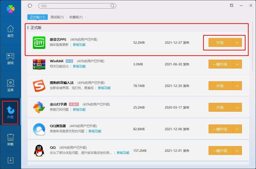 电脑上安装腾讯电脑管家或者是360软件管家的,可以使用这一类软件,在软件升级功能中,查看是否有需要升级的版本,并进行安装升级就行了。
