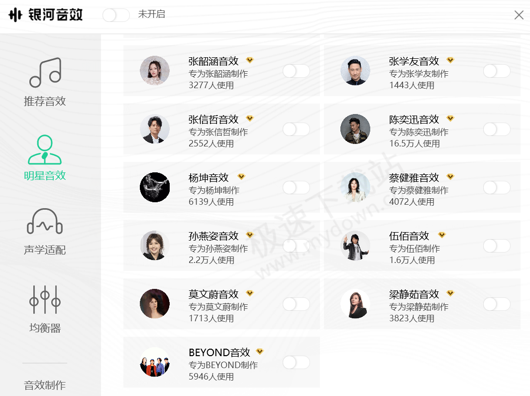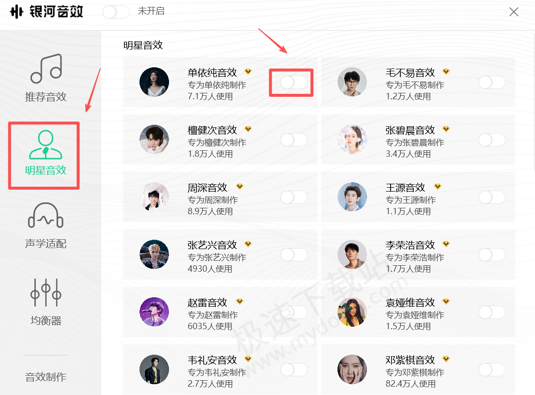 2.在音效面板中点击左侧【明星音效】,然后在右侧选择喜欢的歌手,这样QQ音乐的明星音效就打开啦。