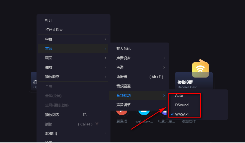 4、进入到音频驱动页面后,可以看到有“Auto”、“DSound”和“WASPAPI”三个选项。