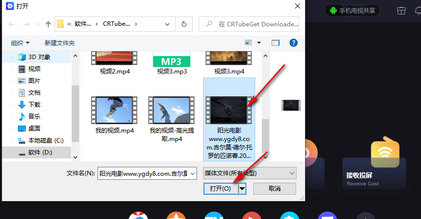 2、在弹出的文件夹页面里选择一个需要播放的视频,点击打开就上传到播放器里了。