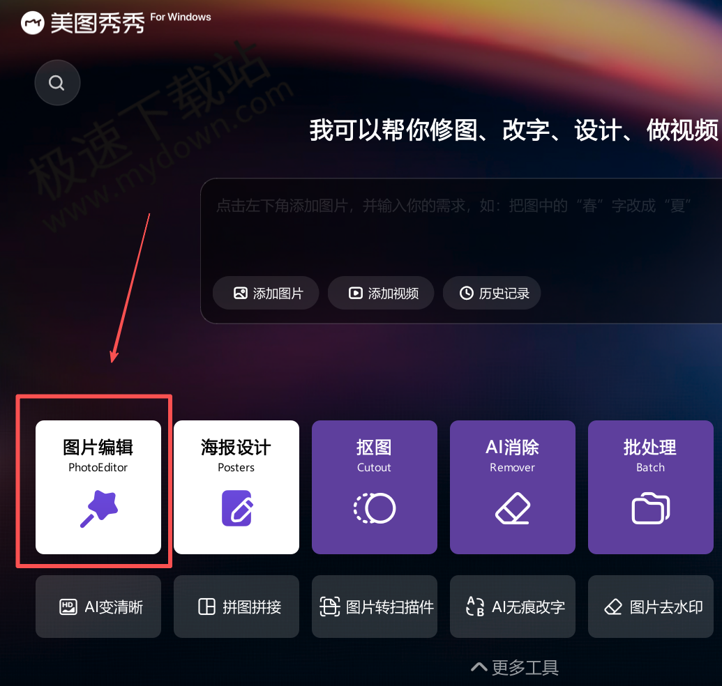 在美图秀秀的首页找到【图片编辑】,然后上传图片选择【AI贴图】工具,通过拉伸将贴图照片贴合底图,然后保存即可,具体方法如下。提示:当前教程所对应的美图秀秀电脑端版本为2025最新版V7.7.7.2。