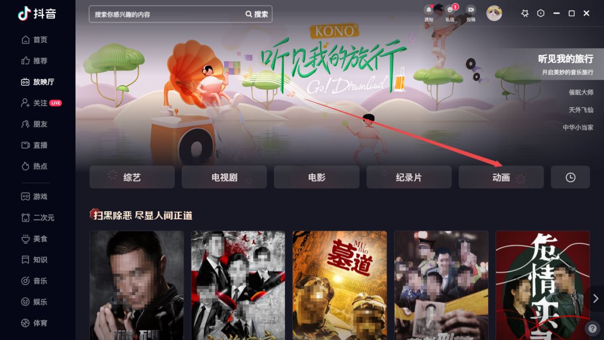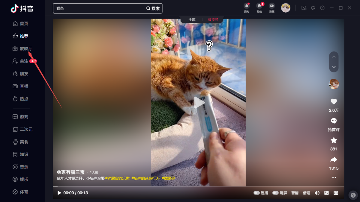 第一步,启动电脑端抖音,然后找到左侧列表中的【放映厅】选项,并点击进入。