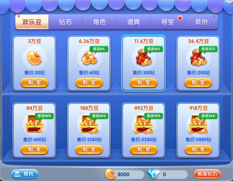 2.钻石与欢乐豆的购买比例是,每个钻石能购买到一千的欢乐豆,不过最低需要购买3万的欢乐豆,也就是30个钻石。