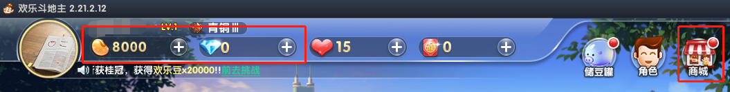 在电脑上打开腾讯欢乐斗地主后,在用户信息下的钻石一栏中,点击右侧的加号键,或者是点击页面右上角的“商城”图标,都能跳转打开商城窗口。