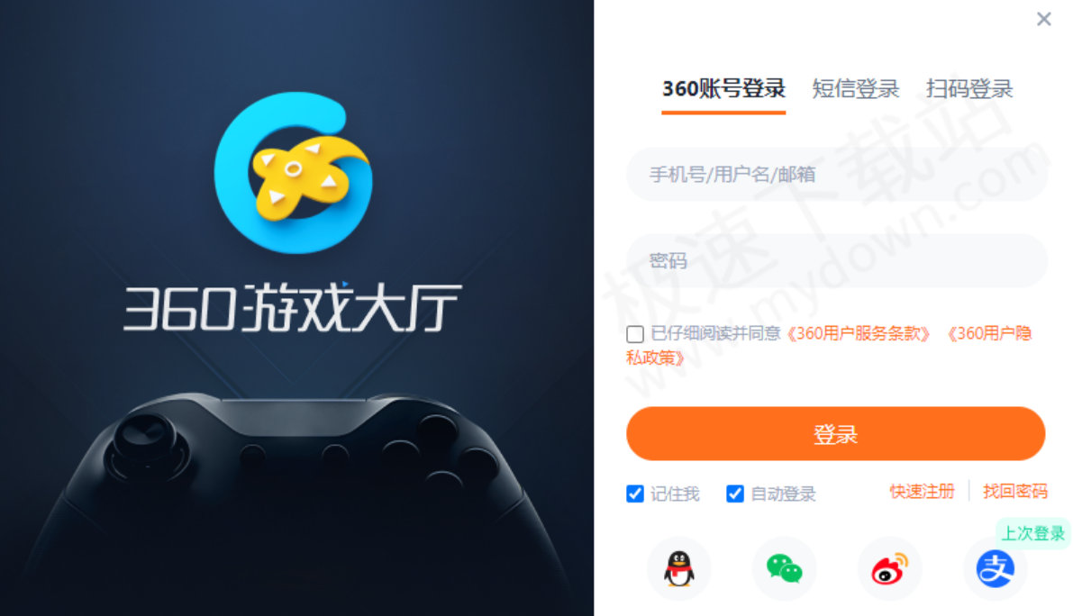 ●360游戏大厅:支持360账号密码登录、短信验证登录以及QQ、微信、微博、支付宝扫码登录。