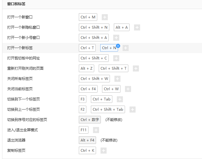 然后是关闭、切换类,属于该类别的快捷键有:关闭所有标签页“ctrl+shift+W”。关闭当前标签页“ctrl+F4”。切换上/下一个标签页分别是F2/F3,或者是ctrl+tab/ctrl+shift+tab。还有就是切换至序号对应的标签页“ctrl+对应数字”(该快捷键无法进行改键)。