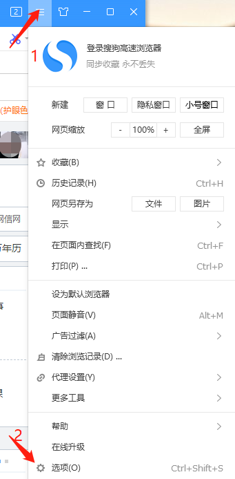 当我们打开搜狗浏览器,在浏览器整个UI的右上方可以找到“三道杠”图标,点击后会弹出“选项”,点击后进入设置页面。