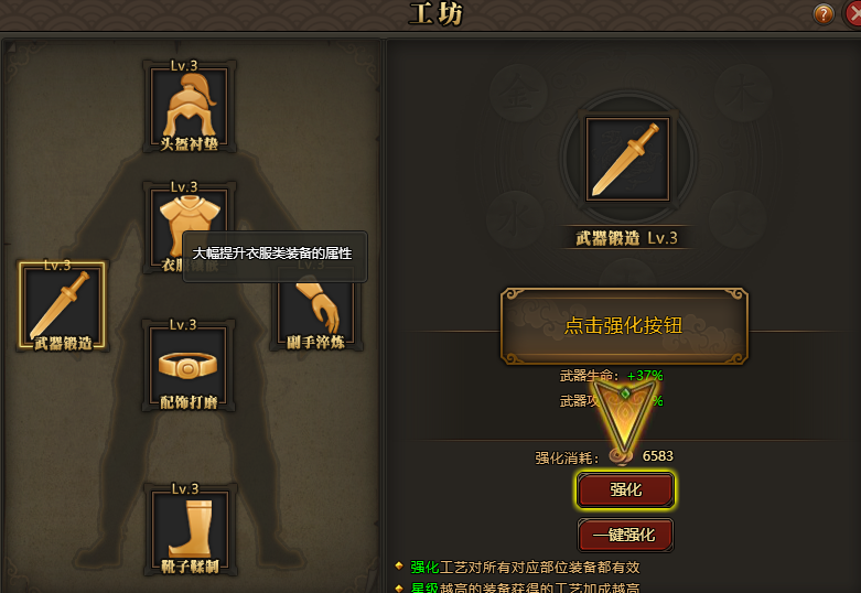 2、武将装备的打造与强化,我们可以不断地打造,以让武将穿上更好的武将装备。另外,光是穿上好的武将装备还不够,我们还可以对武将装备进行强化,让武器装备的能力更上一层楼!