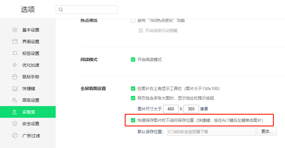 跳转到设置页面之后,在左侧选择“实验室”选项,页面刷新后,下滑知道哦啊“全屏开图设置”一栏,将“快速保存图片时不询问保存位置”选项勾选上就可以了。