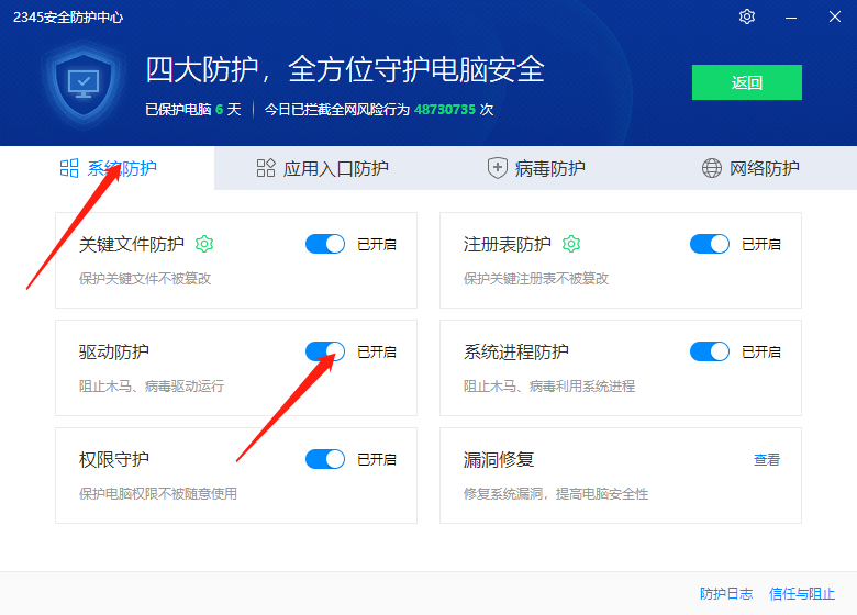 4、然后选择【系统防护】,找到【驱动防护】并将其开启即可。