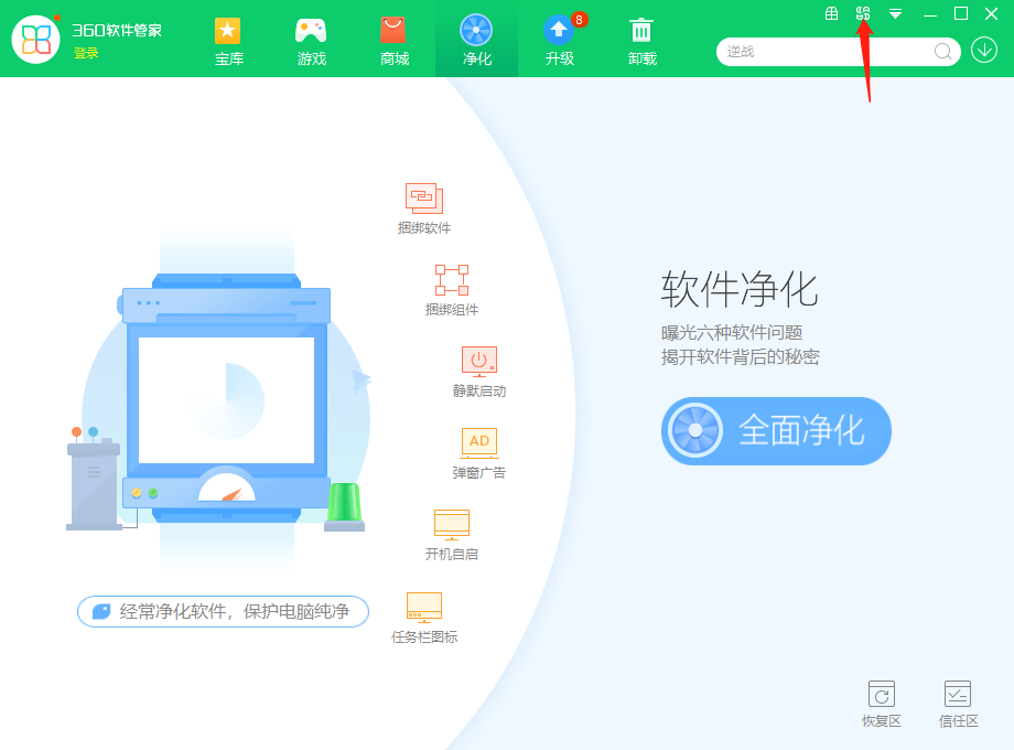 打开360软件管家,我们来到主界面。在主界面的右上方,有三个较小且并不是常见的图标,其中位于中间,也就是“礼品箱”图标右边的小图标,就是360软件管家的软件小助手的入口了。当然,如果此前我们没有用过软件小助手,点击该图标时,360软件管家会自动为我们安装软件小助手插件,安装完成后,软件小助手会在任务栏中出现。