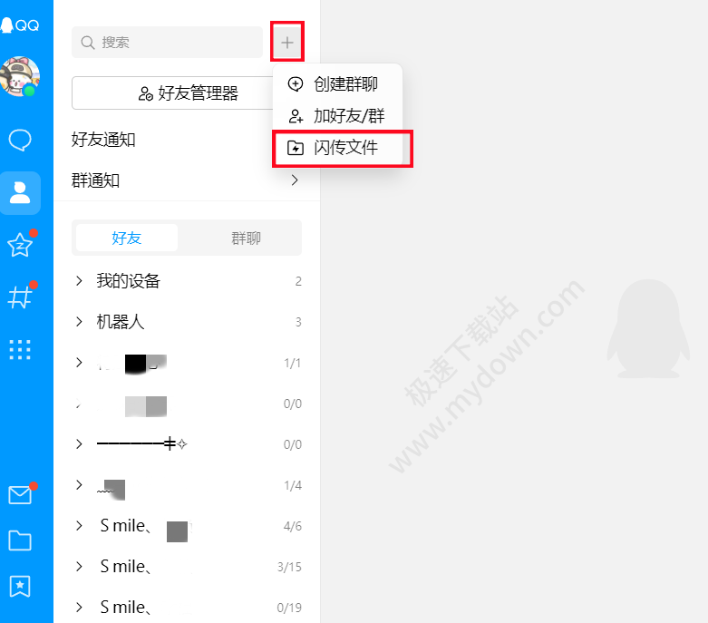 2、进入首页,点击上方工具栏【+】图标→【闪传文件】。
