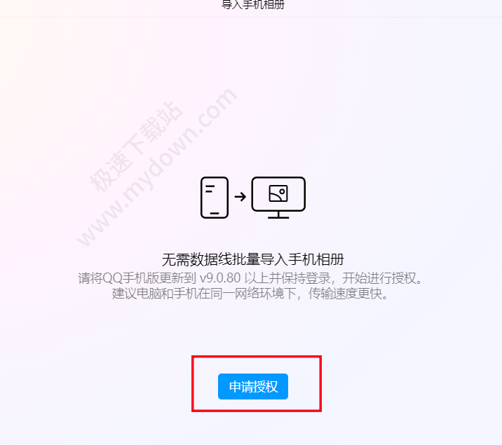 3、进入【我的文件】界面,点击【导入手机相册】后,需申请手机端QQ授权同意,点击【申请授权】在手机上同意授权即可。