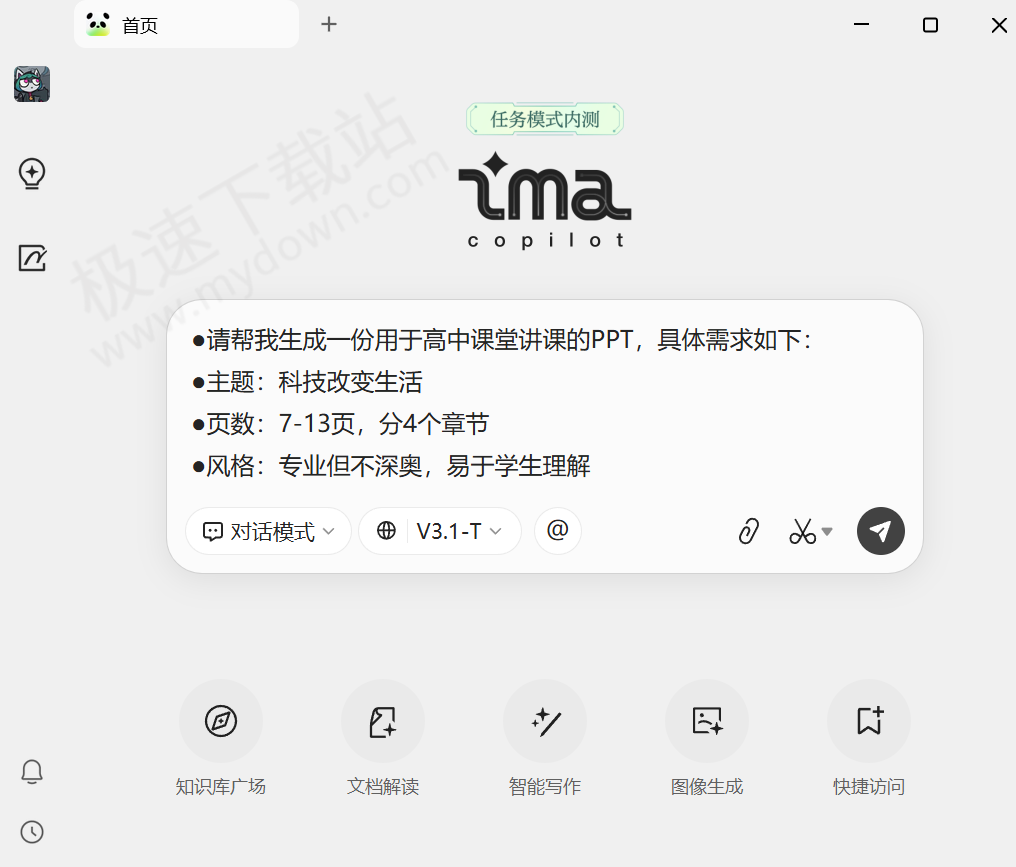 目前腾讯ima最新版本(V2.0.1)暂不支持一键生成完整PPT文件。不过它可以基于用户提供的具体需求,生成结构化的PPT报告或大纲,用户需要先明确PPT的主题、用途、风格等信息,通过提示词告知AI,方可获取对应的内容框架。