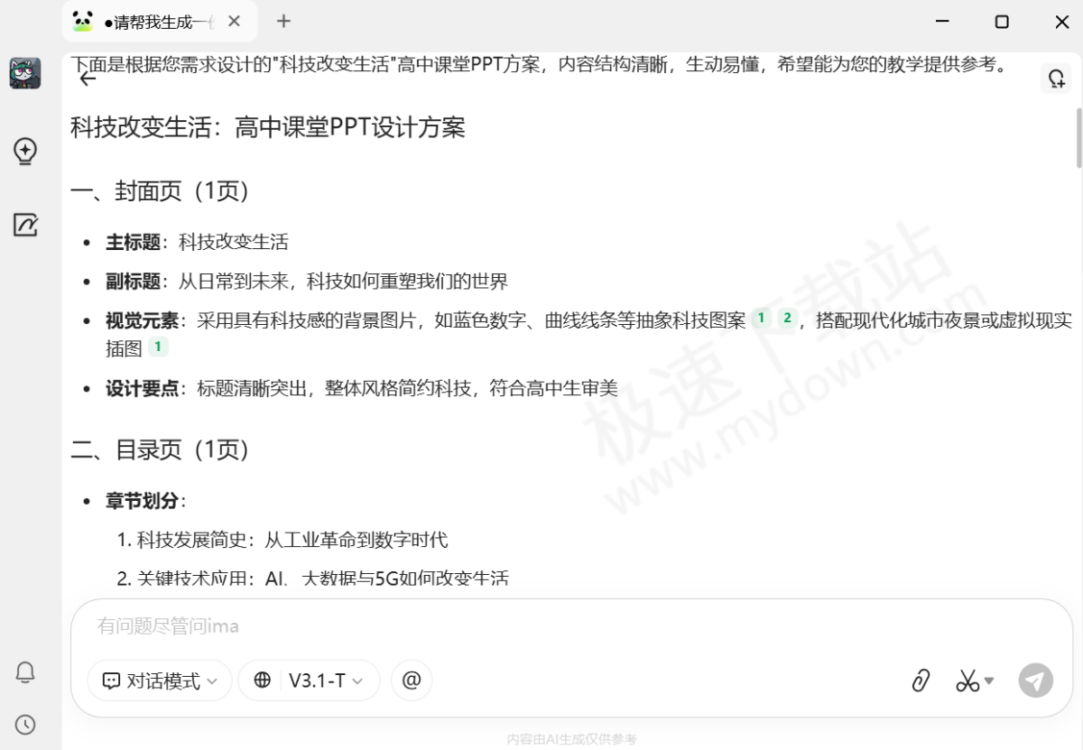 先拟定明确的AI提示词,然后打开腾讯ima手动输入到对话框中,发送后腾讯ima会生成完整且专业的PPT大纲,具体方法如下。提示:当前教程所对应的腾讯ima电脑端版本为2025最新版V2.0.1。