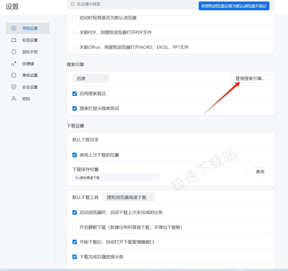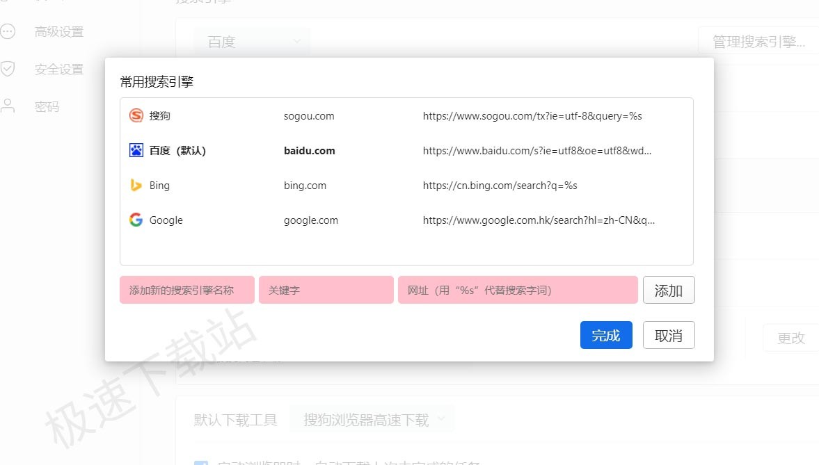以上就是修改搜狗浏览器主页搜索引擎的方法。如果你想添加其他的搜索引擎,也可以按照以下步骤进行操作: