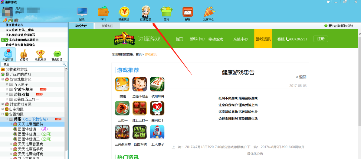 在边锋游戏大厅主页面上方可以找到在线客服,如果大家没法进入大厅内点击的话可以前往官网咨询。