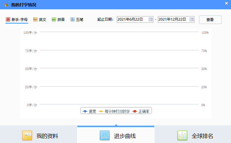 1.在打字测试的过程中,可以直接在窗口下方查看到打字速度,也可以点击进步曲线图标,查看打字测试的历史情况。