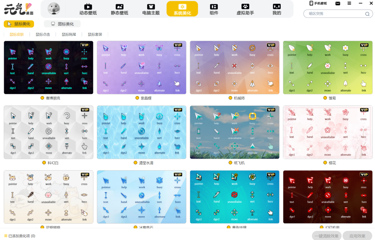 首先第一步,下载元气桌面后打开进入客户端。点击客户端上方“系统美化”选项,然后我们就可以看到下方有“鼠标美化”和“图标美化”。