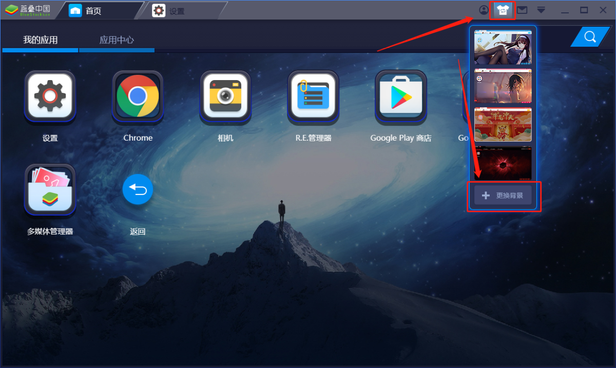 打开蓝叠模拟器之后,如果对模拟器的背景不满意的话,我们可以通过下面的方法来修改一下背景图片。