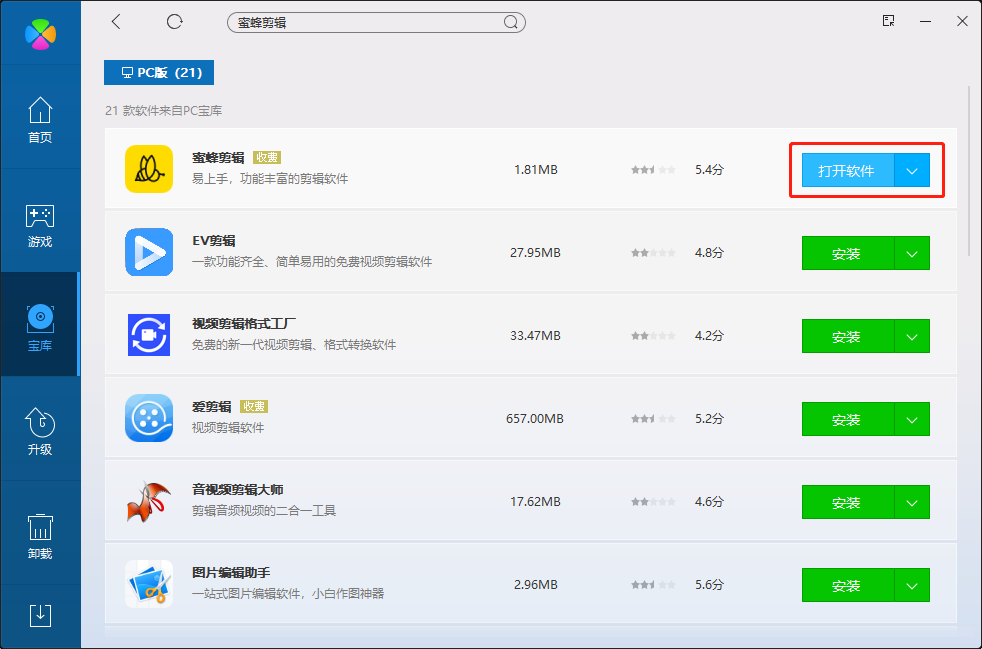 我们还可以使用电脑软件管理工具来下载,小编使用的是电脑管家,我们只需要在该软件中搜索蜜蜂剪辑,然后点击“安装”即可。