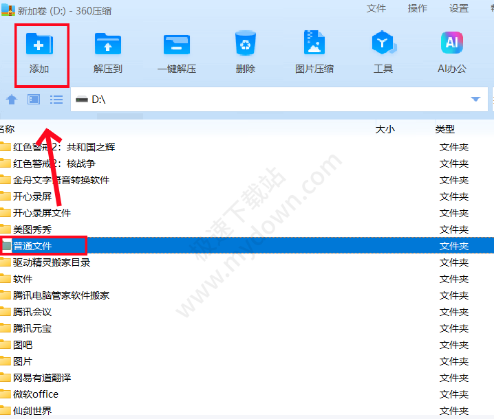 1、打开360压缩软件,选择需要压缩为7Z格式的文件,点击左上角【添加】。