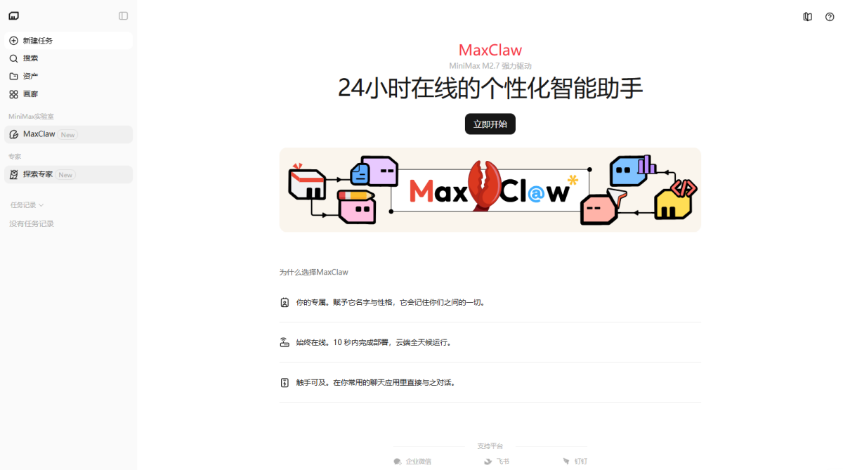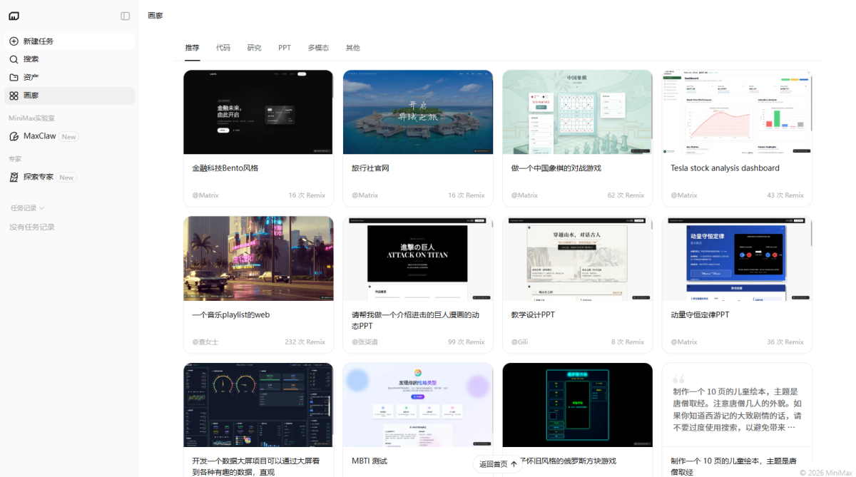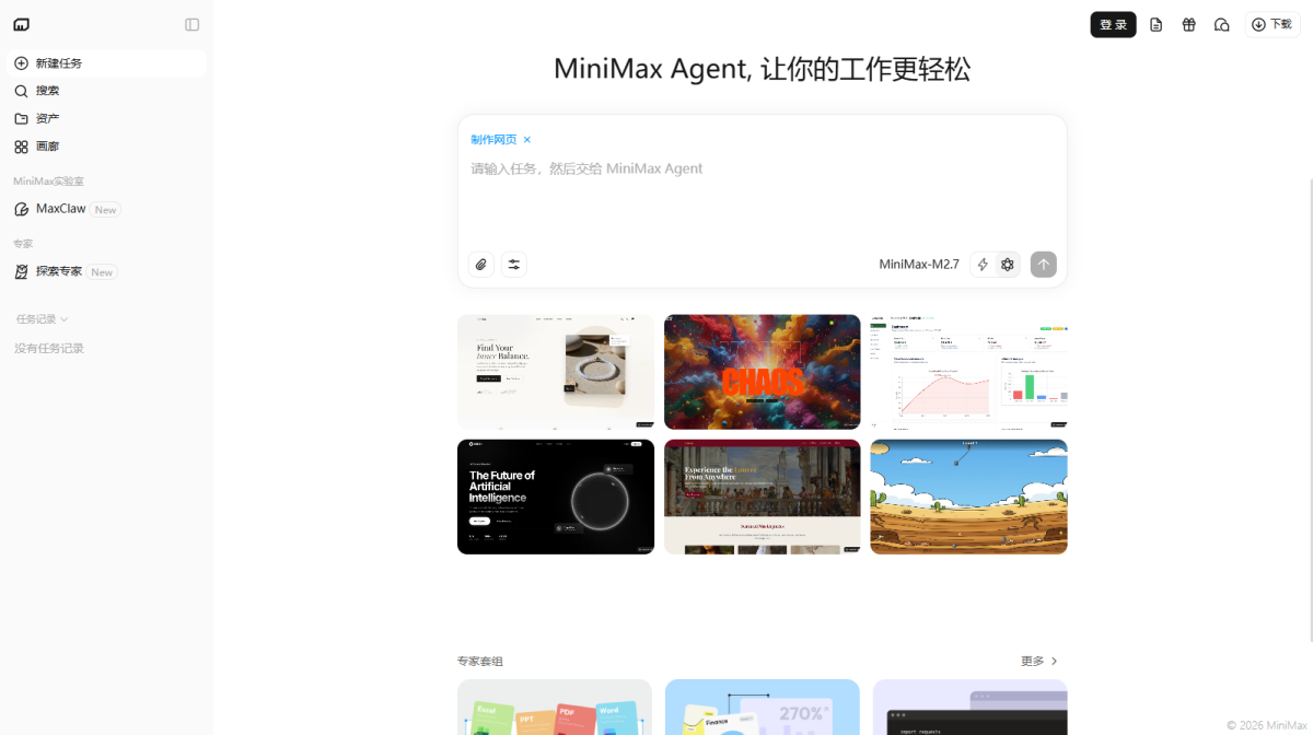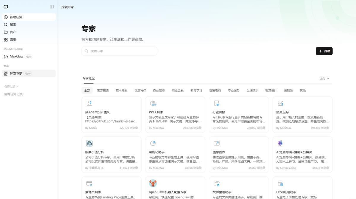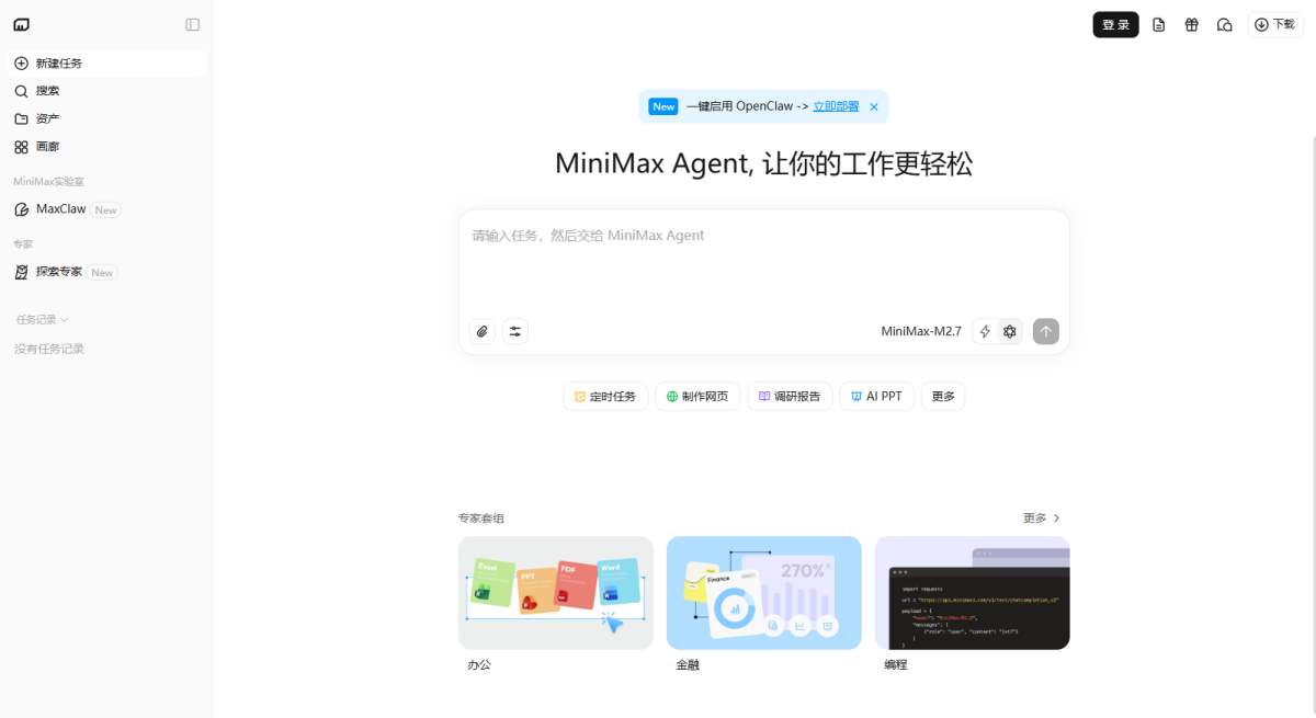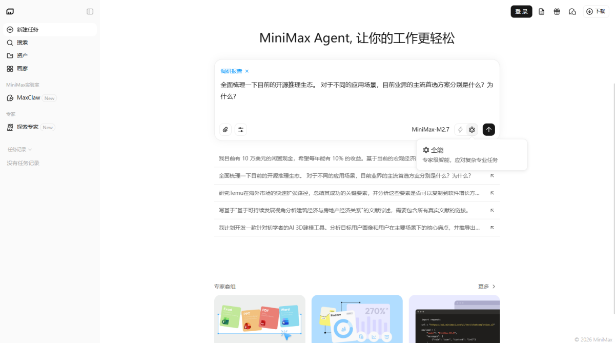 MiniMax Agent 是基于顶尖多模态大语言模型打造的智能AI伙伴,为你带来全方位的智能体验:精准搜索解答、一目了然的图像识别、沉浸式语音对话、专业创意写作、文档闪速解析,还有独家悬浮球功能让复杂任务变得轻而易举。支持MCP多智能体协作,让AI团队为你高效解决复杂问题。10倍速获取信息,10倍速解决问题,无论你是学生、职场人士、自由工作者还是创作者,Agent都能随叫随到,一触即用。AI写作、搜题、办公、翻译、编程、创作、文档总结,甚至是日常聊天、语言学习、面试准备,Agent都能胜任,成为你的全能智慧助手。