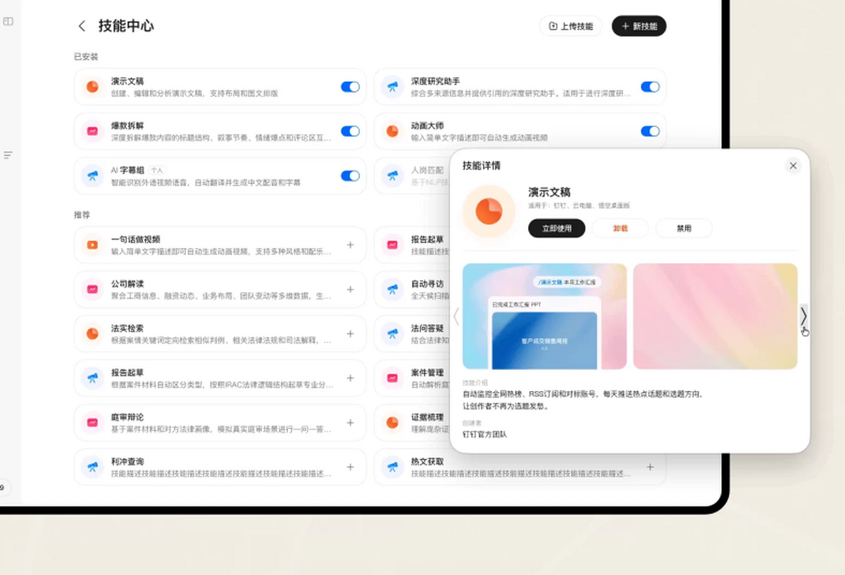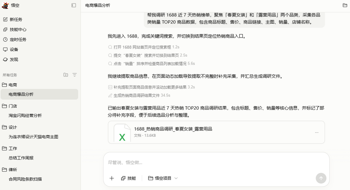 悟空的技能市场持续丰富,覆盖内容创作、电商运营、数据分析、法务财务等多个领域,并支持用户自己添加Skill。