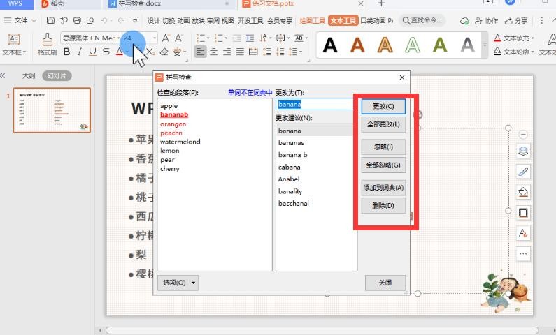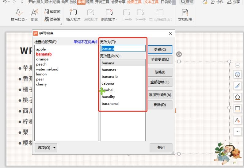 我们可以手动更改为指定单词,或是根据拼写建议进行修改。