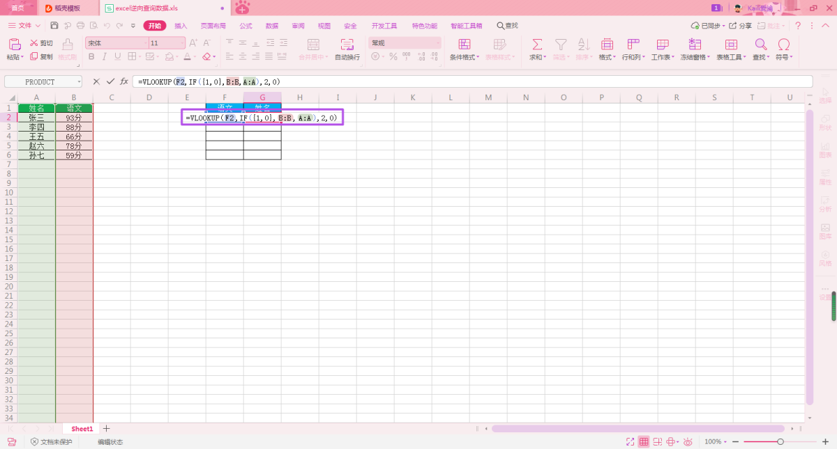 第三步,接着我们选中【G2】单元格,然后在其中输入【=VLOOKUP(F2,IF({1,0},B:B,A:A),2,0)】这个函数。