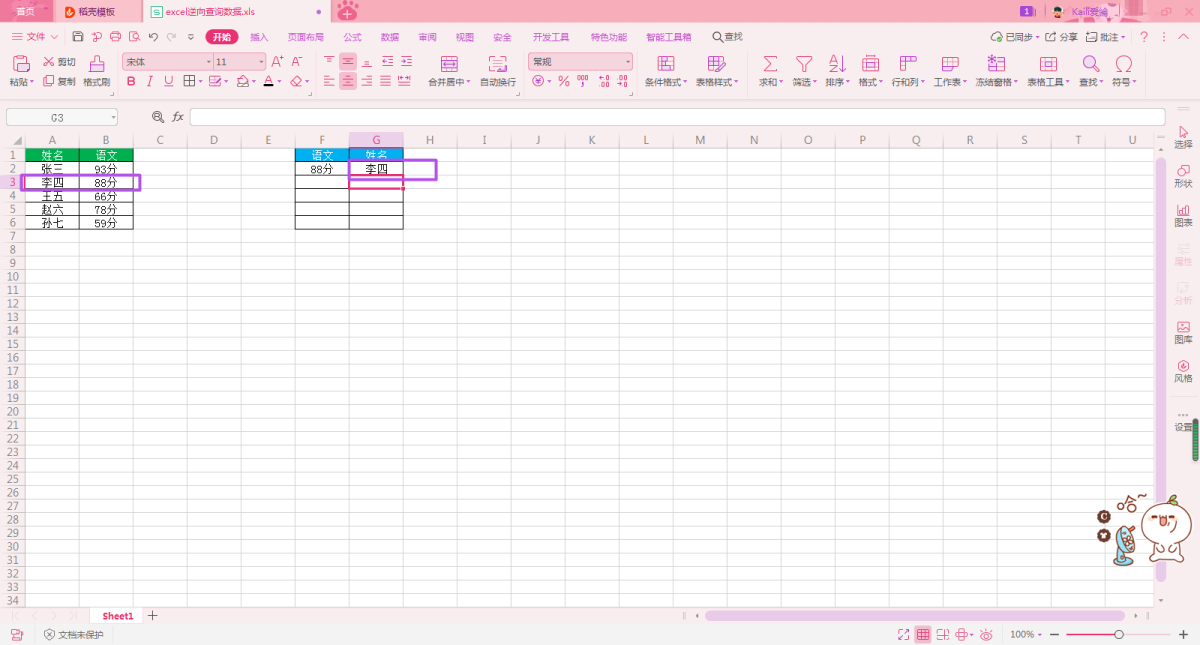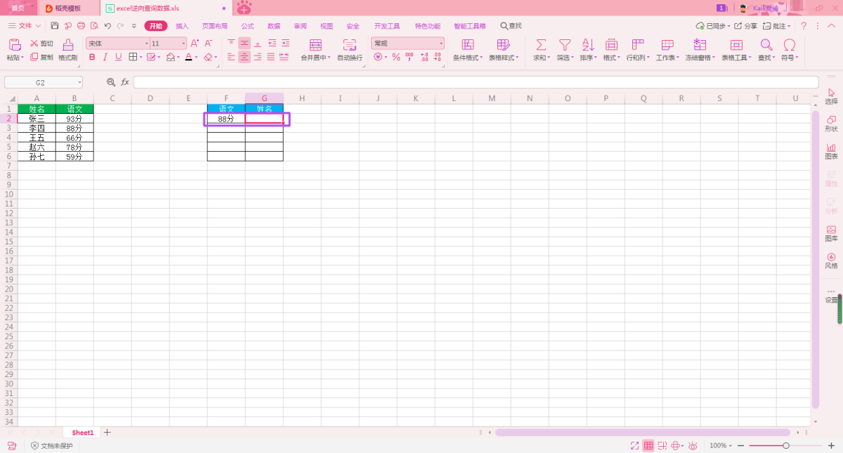 第二步,表格文档打开好以后,我们在表格的【F2】单元格当中,随机选择一个语文的分数,比如【88分】,然后我们需要查找出这个分数所对应的姓名。