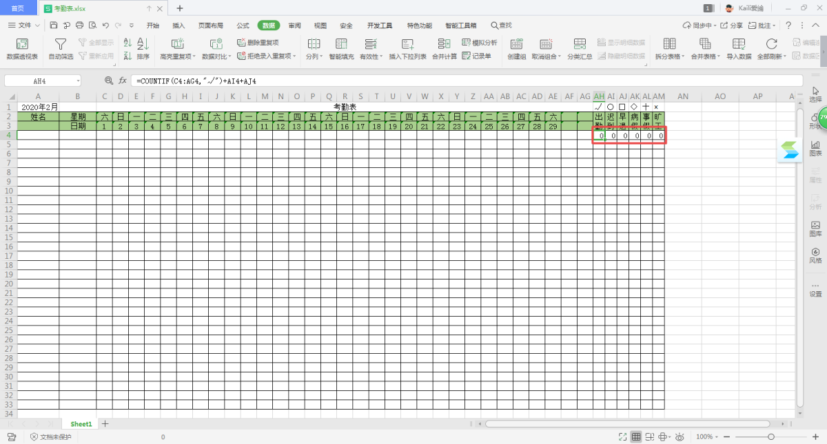 第十九步,下面我们需要输入考勤统计的公式。出勤=COUNTIF(C4:AG4,\"√\")+AI4+AJ4;迟到=COUNTIF(C4:AG4,\"○\");早退=COUNTIF(C4:AG4,\"□\");后面以此类推=COUNTIF(C4:AG4,\"对应的符号\"),只要把符号修改一下即可。