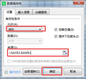 第十八步,此时会弹出【数据有效性】窗口,在此窗口当中,我们将允许选择为【序列】,然后将数据来源选择为考勤表符号所在的单元格,然后点击【确定】就可以了。