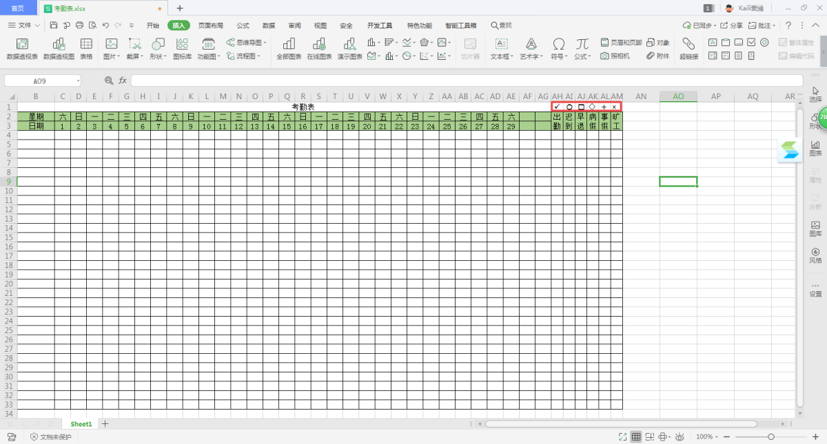 第十六步,接着在所对应的单元格的上方输入考勤符号,出勤=√,迟到=○,早退=□,病假=◇,事假=十,旷工=×。