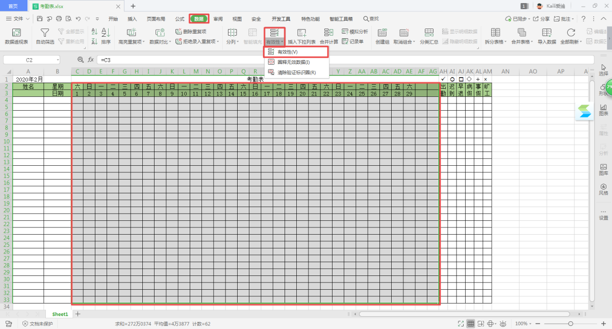 第十七步,下面要做的是数据验证。选中所有需要填写考勤的单元格,然后找到工具栏上方的【数据】选项卡,然后选择【有效性】功能中的【有效性】。